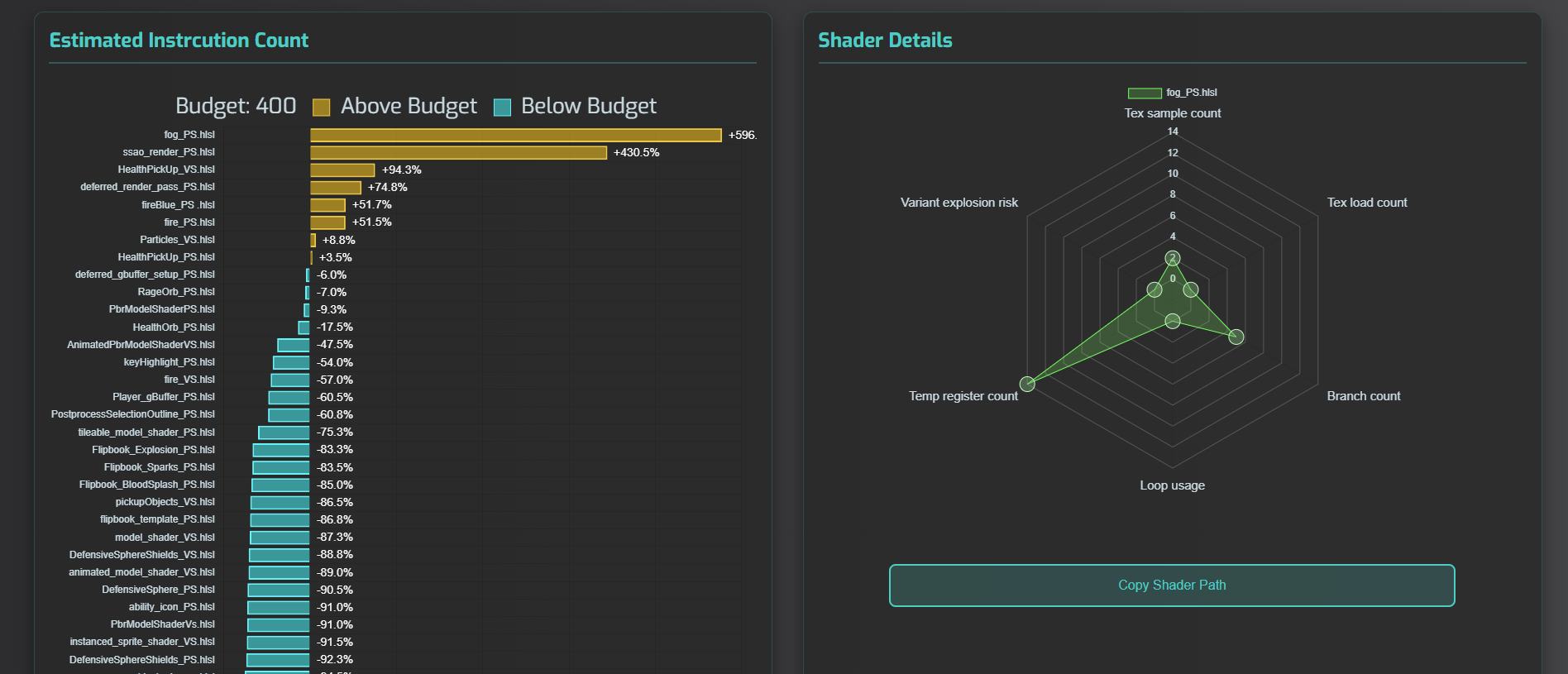 A python tool that scans project files, finds shaders, parses and runs them through FXC compiler. It saves collected data in a JSON file. Using Chart.js and D3.js libraries it allows user to load generated JSON and display data in form of charts.